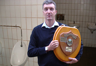 The competition was won by IJO, playing to a level just short of a handicap cut, with Tweedle Dum and Tweedle Dee (Bomber & Lofty) following close behind. We returned to the Hotel for the presentation ceremony which the Committee was approaching with some fear. Don't forget who won last year! Don't forget that he signed a piece of paper, countersigned by member Brew, that he would not destroy or deface the shield. Their fears were not allayed when Dave whispered to Ian - "Don't worry, it can be restored easily to the way it was". For whatever reason Dave requested that he be allowed to pass on the trophy to this year's winner and the committee agreed. What followed was pure comedy genius. Dave presented a spoof Dragons Den (spotted immediately by Kev H) where the proposal was that he had invented a combined trophy holder and advertising medium, the script original, the style very Harry Enfield & Paul Whitehouse, but still absolutely brilliant. Why do we never have a video camera with us? Oh yes, too many incriminating possibilities. As IJO had to get off and proudly show his new trophy to his sister, who lives locally, we adjourned at a civilised time to start the evenings serious drinking and cheering on Europe in the Ryder Cup - not.